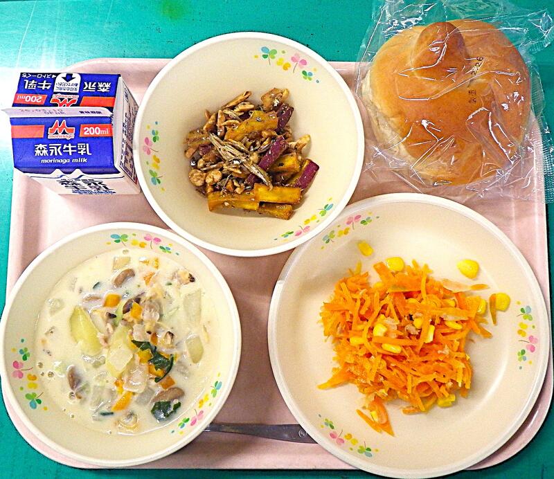 ◎今日のパンは、給食センターで手作りされた特製パン!外はカリッ、中はモチモチ、表面はチーズのパリっと感が絶品でした。口に入れるとオリーブオイルの風味が広がり、もう一口と進みます。ポークビーンズも具沢山で元気が出ます。ひじきのマリネも、とっても美味しかったです。
