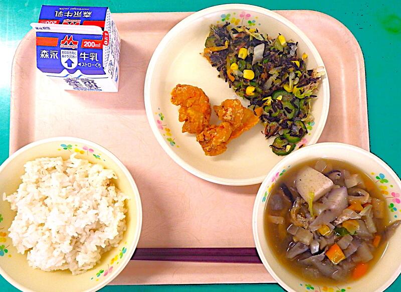【3/9本日の献立】から揚げ・のっぺい汁・ひじきと梅のサラダ・麦ご飯・牛乳
