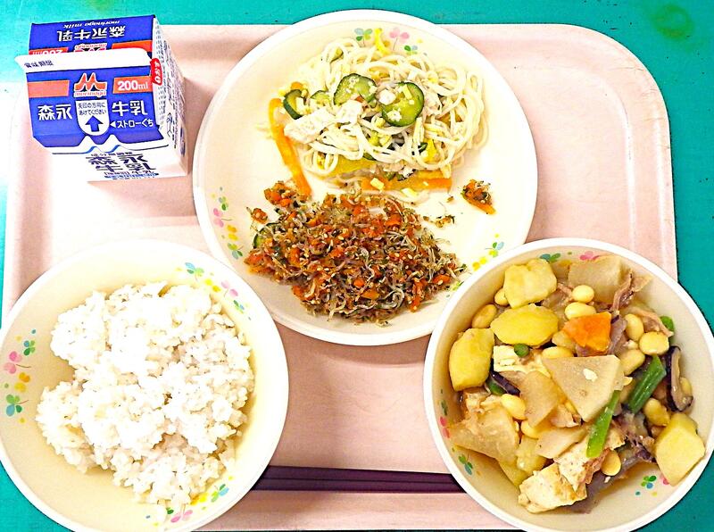 【3/10本日の献立】大豆の五目煮・そうめんサラダ・てづくりふりかけ・麦ご飯・牛乳