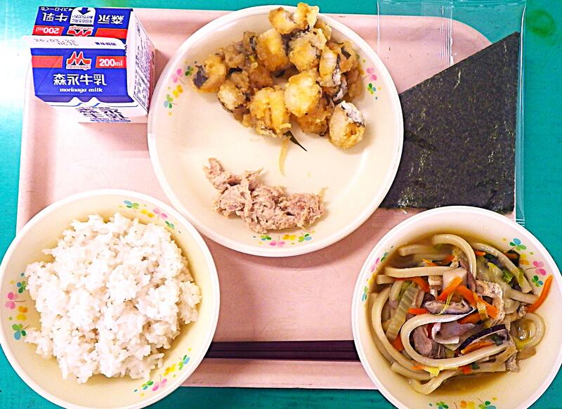 【3/11本日の献立】セルフおにぎり(ツナマヨ)・五目うどん・魚のたまねぎソース・牛乳