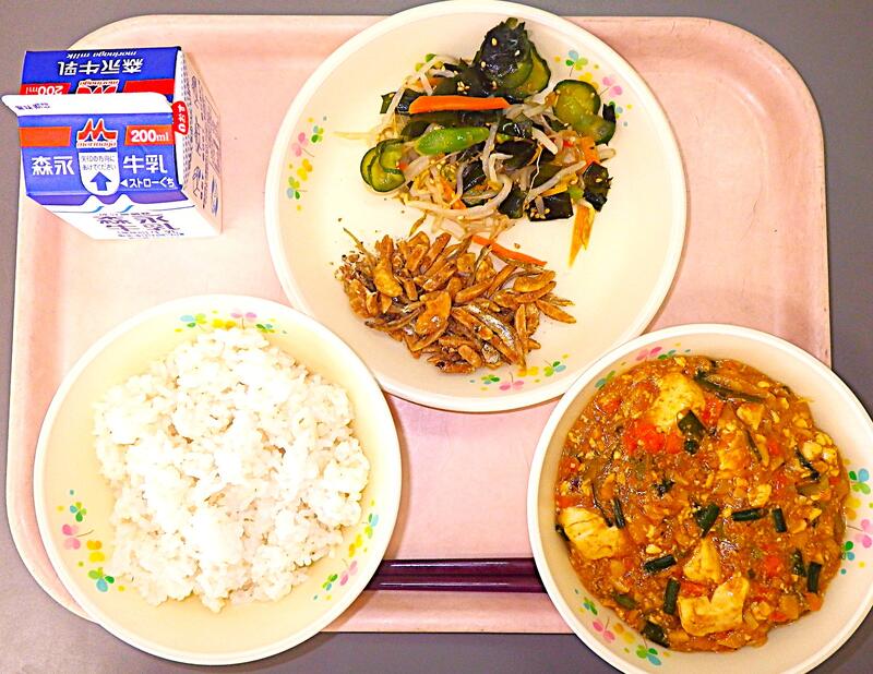 【3/12本日の献立】マーボー豆腐・ナムル・ナッツのかりんとう・牛乳