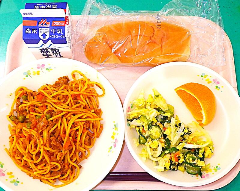 【3/13本日の献立】ミートソーススパゲティ・ミモザサラダ・みかん・ミルクパン・牛乳