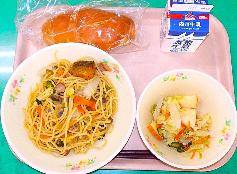 【12/12本日の献立】ペペロンチーノ・さわらクリスピー・りんごサラダ・ミルクパン・牛乳