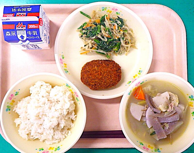 【1/20本日の献立】くじらのメンチカツ・ごまあえ・ぶたじる・むぎごはん・牛乳