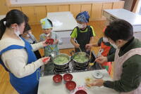 2年生は、収穫祭で大根の味噌汁を作成中です。