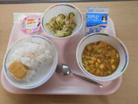 メニューは、麦ご飯、チキンナゲット、カレー、彩りサラダ、お祝いデザートです。