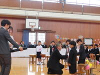 「修了式」という言葉には、一年間の学習を終えたことを「認めたり、祝ったりする」という意味があります。通知表に書かれた修了証は、「一年間よく頑張りました。次の学年でもさらに羽ばたいてください」という、先生方からの応援のメッセージでもあります。学年の代表に修了証を手渡しました。