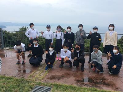 30分もすると、口之津港に到着。(久しぶりに訪れてきれいになっているのにびっくりしました。口之津港で長崎のバスに乗り、長崎市内に向かいます。車内では、自己紹介ゲームで盛り上がりました。途中の愛野で記念撮影をしました。