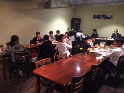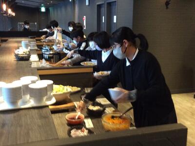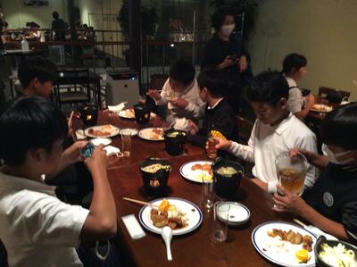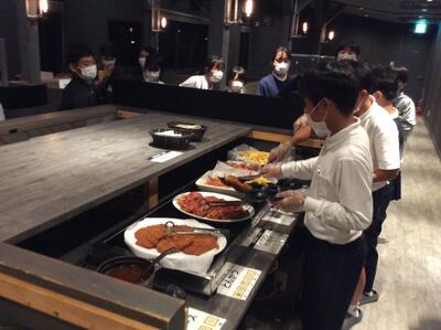 夕食もバイキングで、子どもたちの好きなメニューが勢ぞろい。何度もおかわりをしてお腹が苦しくなった子もいました。