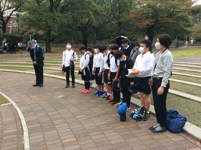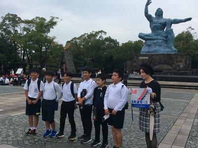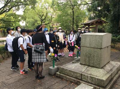午後の平和学習。まずは城山小学校。もっとも爆心地に近い学校で、一瞬にして無惨にも1,400余名の児童や教職員など多くの尊い命が奪われました。被爆校舎を改装して作られた平和記念館で資料を見学した後は校庭に出て運動場に行くと、慰霊と平和への願いを込めて植えられた「嘉代子桜」の前でみんなで写真を撮りました。