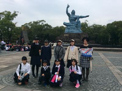 午前10時30分、最初の学習地である長崎スカイホテルに到着しました。ここでは、被爆体験者の方のお話を伺いました。4歳の時に被爆され、その後病気で苦しまれた辛い体験を子どもたちに分かりやすくお話くださいました。今も世界で起こっている戦争をなくしていこうと、ミニチュアアクセサリー「戦争ほうき」を作成し、世界中に広める活動をされているそうです。私たちも、平和を守るため、何ができるのか考え行動していきたいものです。
