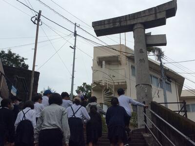 最後にもう一ヶ所、原爆で鳥居の片方だけ残っている一本柱鳥居と山王神社境内の被爆したくすのきを見学し、平和学習終了。