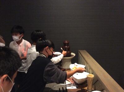 食事もバイキングで、好きなおかずを選んでお腹いっぱい食べていました。デザートのチョコフォンデュがみんな気に入っていたようです。