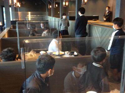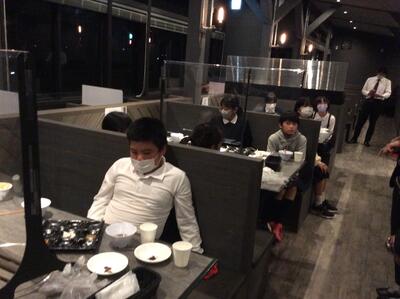 外は少し寒かったので、予定を変更して朝食会場で退館式を行いました。快適な宿泊体験ができたことに感謝の気持ちを代表が伝え、みんなでお礼を言いました。