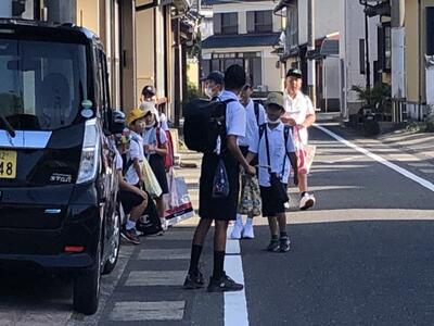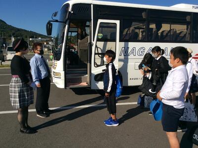 午前6時40分。体育館前には苓北町内の5年生を乗せたバスが到着。富小5年生全員体調もバッチリ!保護者や先生方に見送られ、元気に出発していきました。