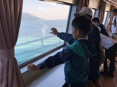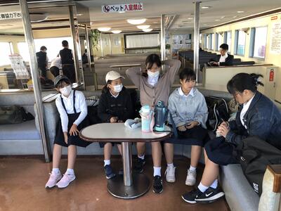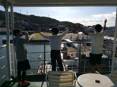 牛深港で出発式を行い、蔵之元港行きのフェリーに乗り込みます。フェリーの中も、みんな楽しそうです。