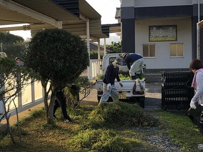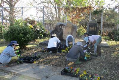 毎年2回、富岡小の正門横の花壇や教頭住宅側の門横の花壇に、苓中21期会の方々がきれいな花を植えてくださっています。この日も、12人の苓中卒業生(小学校は志岐小、富岡小卒業)の方が、苓北中、志岐小の花壇の花植を終え、富岡小にきてくださいました。この活動、何と10年以上も続けられているそうです。同級生同士、話にも花を咲かせながら、楽しそうに作業をされていました。