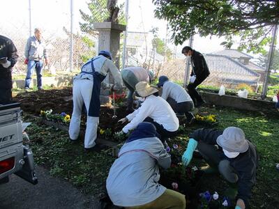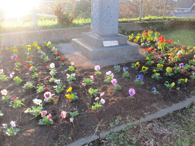 今回は、かわいい色とりどりのパンジーの花が花壇に植えられました。(レイアウトもしっかり考えてくださっています。)最後は、みなさんで記念撮影。