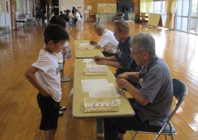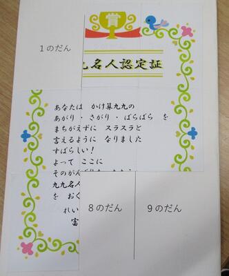先生方に九九をテストしていただき、合格するとシールやスタンプをもらい、子供たちもやる気満々です。たくさんの先生方のチェックを受け、それぞれの段の名人に認定されるとシールが貼られ、全部合格するとかけ算九九名人認定証ができあがります。