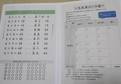 昼休みになると2年生の子供たちは、下のようなかけ算九九カードを手に持ち、職員室や校長室などいろいろな場所に出かけ、たくさんの先生に、上がり九九、下がり九九、ばらばら九九のテストをしていただきます。