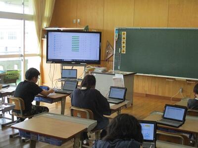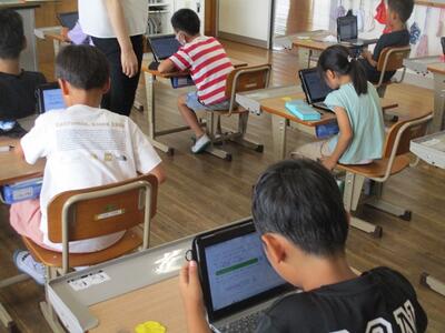 3年生は、グループになって何やら話し合い?聞いてみると「時間を守らない、忘れ物が多い・・・」など学級の問題についてその改善策など意見を出し合っていたそうです。いい学級にしていこうという思いが伝わってきました。4年生は、タブレット学習。キーボー島(タイピング練習)にチャレンジしていました。30級から始まりますが、もうすでに1,2級に到達している子も・・・キーボードを打つ速さにびっくりしました。