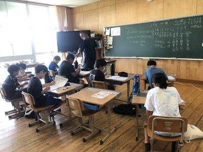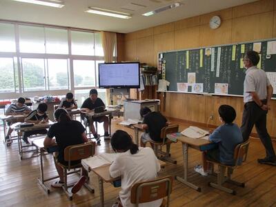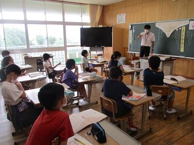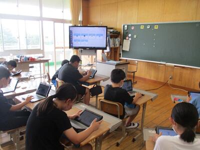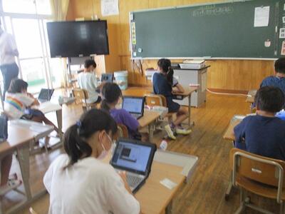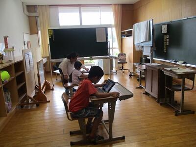 1年生は、タブレットを使いeライブラリ学習。3つの数のたし算を学習し、答えが10になるたし算を自分で考え発表し合っていました。2年生もタブレット学習に取り組んでいました。タブレット操作にも慣れ、楽しく意欲的に取り組んでいました。
