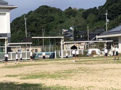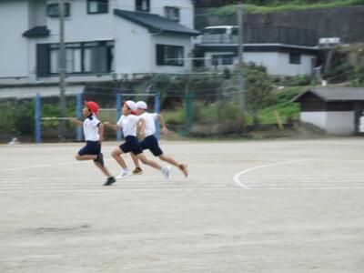 明日は、苓北部会陸上記録会です。今日は、最後の練習が運動場で行われていました。まずは、ウォーミングアップ。