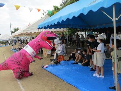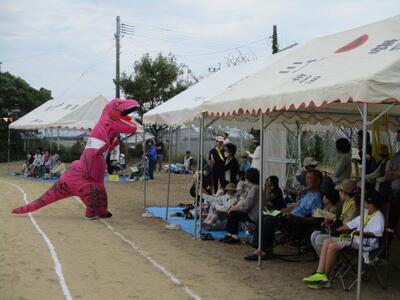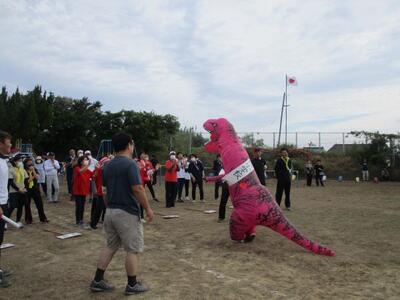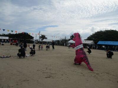 競技が和気あいあいとした雰囲気で進む中、プログラム4番「パン食い競走」でスペサシャルゲストが乱入?!創立150周年実行委員長(富岡公民館長)扮するティラノサウルス君です。会場は大盛り上がり・・・各地区のテントや選手の招集場所にもお邪魔し、激励と150周年の宣伝に大忙しのティラノサウルス君でした。