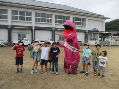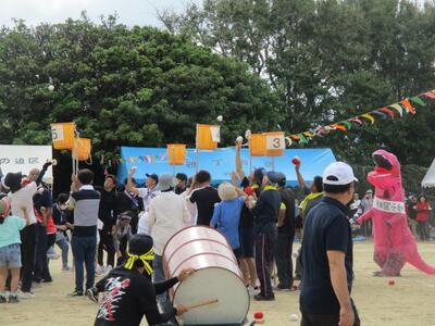 子供たちも大喜びで、「写真を一緒にとってください」とスター気分を味わっていたティラノサウルス君、全地区対抗による玉入れ競走も大いに盛り上げていました。