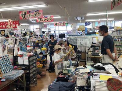次は、「トータルファッションもり」。店内に衣服ばかりでなくバッグや靴、駄菓子やミシンなども置いてあるのに驚いていた様子でした。