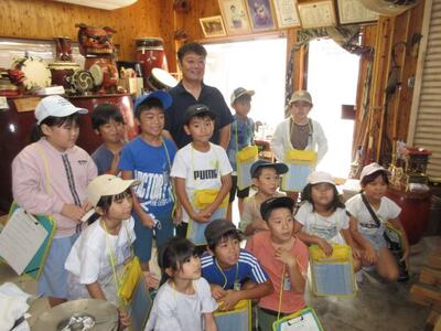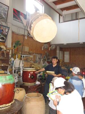 3つめの探検場所は「岩下太鼓」。中に入ると子供たちの身長を超える大きな太鼓の部品がいくつも置いてあり、みんなびっくり。太鼓の秘密についてたくさん教えていただきました。