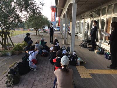出発式。楽しく学びの多い旅行にしていこうと意欲満々の表情です。2日間お世話になる添乗員や朝早くから見送りきてくださった保護者、先生に挨拶をして船に乗り込みます。