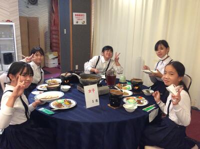 次はお待ちかねの夕食タイム。まず、添乗員さんから、時間前にきっちり集合し、話をしっかり聞く富小6年生の行動がとても素晴らしく、全て予定通りに第1日目の日程が終了したことを褒めていただきました。ご褒美に、長崎名物の蛇踊りの方と一緒に写真を撮ってもらいました。
