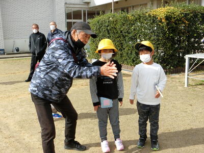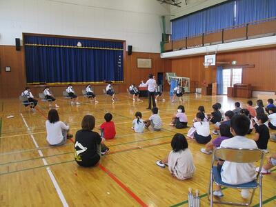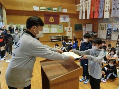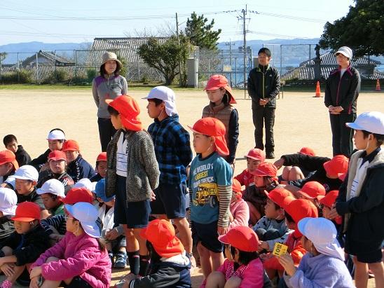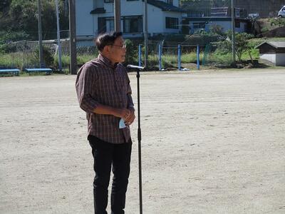 この日、以前100メートル走の日本タイ記録を出され、オリンピックの候補選手にまでなられたことのある西川軍一さんがちょうど苓北町坂瀬川に帰郷されていて、陸上記録会を見にきてくださいました。閉会式では、子供たちの頑張りをほめてくださり、子供たちも嬉しそうでした。最後の後片付けまで、積極的に動いてくれた富小の5・6年生でした。将来、富小からもオリンピック選手が出るかもしれませんね。