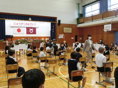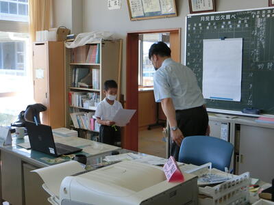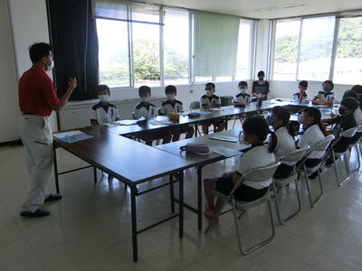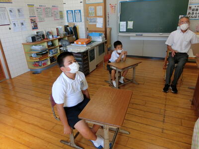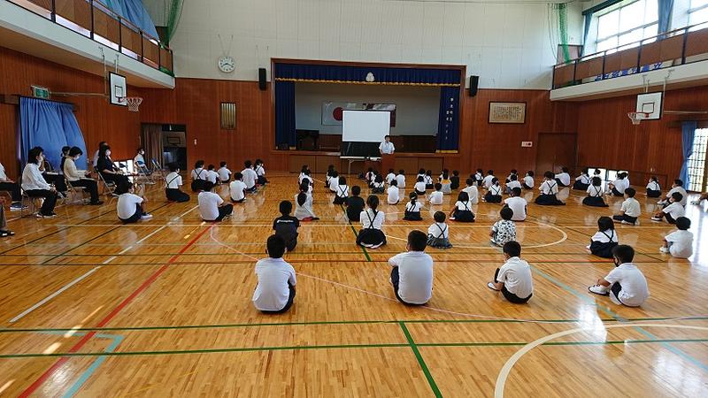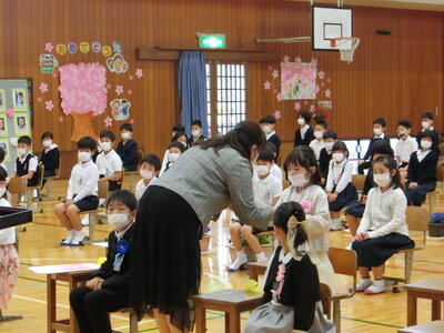 今年度は、10月と2月の木曜日の合計7回が予定されています。まず、この日は校長室で発足式が行われ、担当から実施方法等について説明がありました。その後、1・2年生の代表の子がお迎えに上がり、子供たちの待つ教室に向かいます。