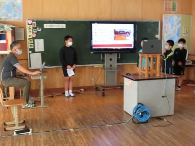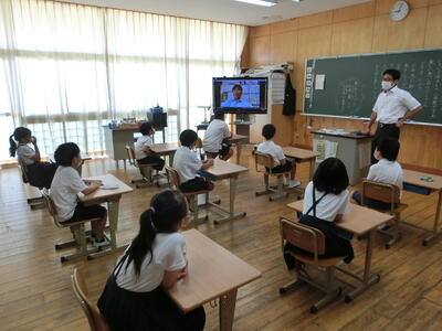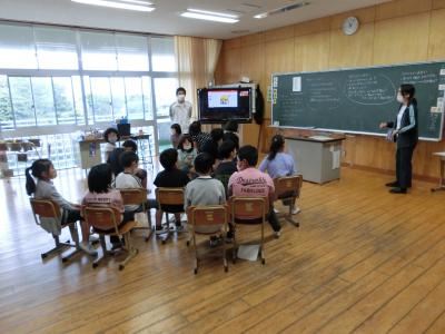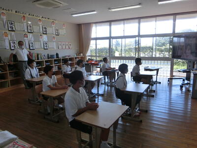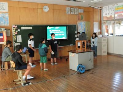 その学習の一つに、苓北支援学校との交流があります。1学期はコロナ禍でオンラインによる交流で、お互いのことを知り合う活動を行いました。2学期は、富岡小の4年生が、苓北支援学校の友達の様子を知り一緒に楽しめるようなゲームなどを考えていきます。この日は、支援学校の先生が来校され、日頃はどんな学習を行っているのか映像などを使って説明していただきました。支援学校の友達が使っている、先生自作のロボットも操縦することができました。