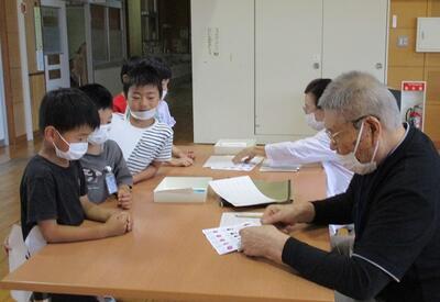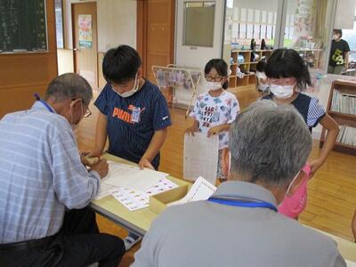 算数の計算プリントに取り組み、計算が終わった子どもたちはホールで待機する「丸つけ先生」のところに向かいます。「わぁ~ すごかね。全部あっとるよ。」「おしかった。ここをやりなおしてこようか。」など学習ボランティアの方から、温かい言葉をかけていただき、より一層やる気を出して頑張っていました。