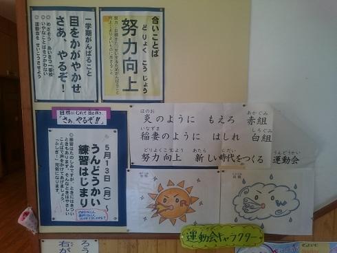 階段のところには校長先生からのメッセージ、運動会スローガン、運動会のマスコット
