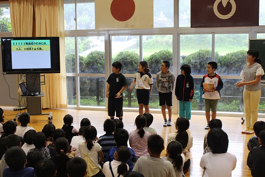 給食委員会の発表がありました。赤、黄、緑の食品を好き嫌いせずバランスよ