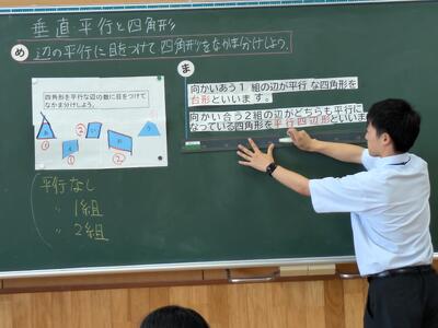 さて、4年生の算数。「垂直平行と四角形」の学習の様子をお知らせします。
