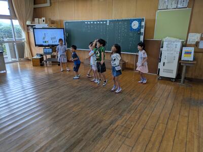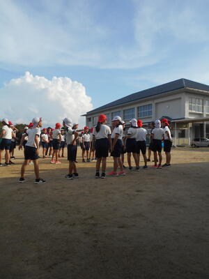 3年生はみんなで遮光板を使って、太陽を観察しながら、カゲのでき方を観察中です。まだ空が夏っぽい感じなんですよね。