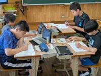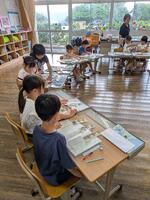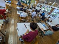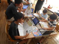 午前中の算数の時間です。こっちでは子どもたち同士で考え、先生と一緒にヒントをもらいながら考えています。学び方を自分で選択しながらの学習です。