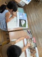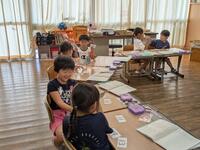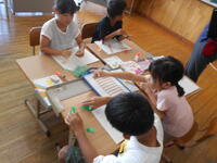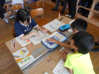 1年生の様子です。最初の挨拶からスタート。もくもくと問題を解いていきます。解き終わったら赤ペン先生のもとに。〇をもらってにこにこ。シールをもらってにこにこ。赤ペン先生もその様子を見てニコニコでした。