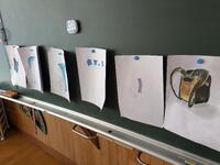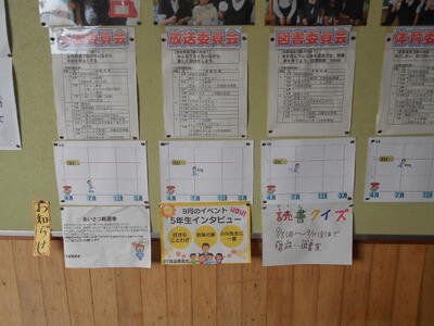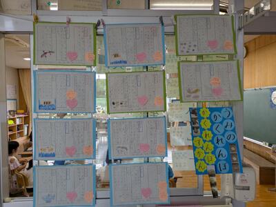 1年生教室の掲示は「うみのかくれんぼずかん」です。それぞれが、すきな生きものを調べて書いたんだろうなあ。