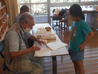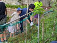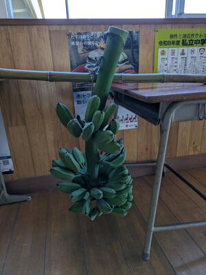 地域の方が、自生するばななを子どもたちのためにともってきてくださいました。売ってあるバナナより少し小ぶりですがたくましいバナナです。今年は台風もなく、そして、気温も高かった(高すぎた・・・)こともあって、すくすく成長したとのことでした。