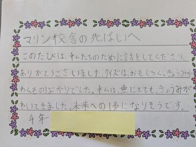 「今日はいそがしい中にレタスのひみつやどうつくっているのかを教えてくださってありがとうございました。わたしがはじめて知ったことは、レタスやお米は作る季節がちがうということです。前まで、いつでもつくることができるのかなあと思っていました。本当のことが知ることができてうれしかったです。これからも農家の志度とがんばってください」