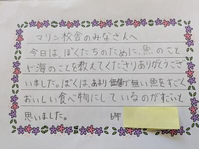 「今日はレタスのことを教えてくださってありがとうございます。レタスの苗植えをさせてくださって、ぼくはうれしかったです。ぼくがびっくりしたことは、季節ごとにつくるものをかえていることです。これからお米やミカンのことも勉強してみたいです。ありがとうございました。」