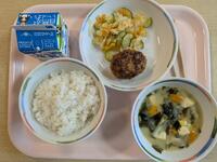 最初は来客の皆さんと一緒に食べた給食からです。ブタキムチご飯、肉団子と春雨スープ、ゴマネーズサラダです。