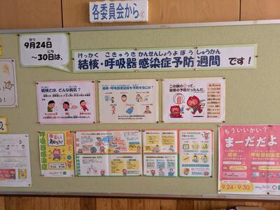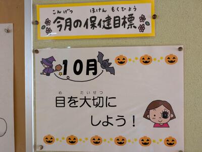 でも、まだまだ暑いですよね。10月も半ばが近づいているのに....。さて、保健室横掲示板は目の愛護デーに関する内容です。今月の保健目標も「目を大切にしようです」