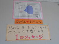 教室の後方にはスマイルアクションが掲示してあります。アンケートをとって、子どもたちがその結果を分析して、もっと学級がよくなるためにはという視点で考えます。子どもたちが考えたスマイルアクションは「だめなことをしている人には優しく注意しよう!」です。